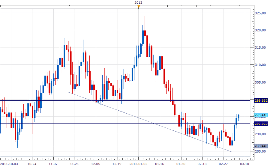 Az euró forint keresztárfolyam 285 és 294 közötti sávot épített fel az elmúlt hetekben, majd egy dupla mélypont formációt alakított ki. Miután meghaladta a dupla mélypont által kijelölt célárfolyamot, ismét erőt vett rajta az emelkedés és 294 fölé emelkedett az árfolyam. Amennyiben a devizapár a kitörés utáni korrekciót követően tovább tud emelkedni, akkor a 300-as zóna állhat ellen.