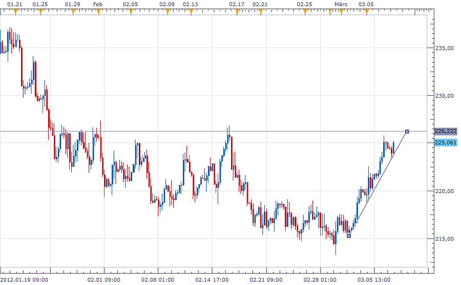 Az amerikai dollár árfolyama az euróhoz hasonlóan jelentőset erősödött az elmúlt időben a forinttal szemben. A 4 órás grafikont megvizsgálva jól látható, hogy hamarosan egy ellenállási zónához ér. Mivel az árfolyamot terelgeti az emelkedő trendvonala, így amíg ez nem esett el, vételi pozíciókat kereshetünk. Amennyiben az árfolyam egészen a 226-os ellenállási szintig elér, majd letöri a trendvonalat, úgy egy jó lehetőséget kaphatunk, hogy a forint erősödéséből profitáljunk. Amennyiben az árfolyam áthalad az ellenállási zónán, akkor vételi lehetőségeket érdemes keresnünk.