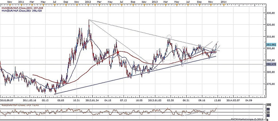 A grafikonon látszik, hogy a keresztárfolyam eközben egy másfél év alatt kiépült csökkenő trendvonalat tört át 298 forint magasságában. Ez, az előbb említett emelkedő trendvonallal együtt egy szimmetrikus háromszög alakzatot rajzolt a grafikonon. Bár a devizapiacon az alakzatok megbízhatósága sokak szerint kisebb, mint például a részvények esetében, azonban célárat lehet számolni belőle. Ez pedig elvileg alsó hangon is 20 forintot jelent a háromszögből való kitöréshez számolva, ezt a mozgást nagyjából 318 forint magasságában teljesítheti az árfolyam.