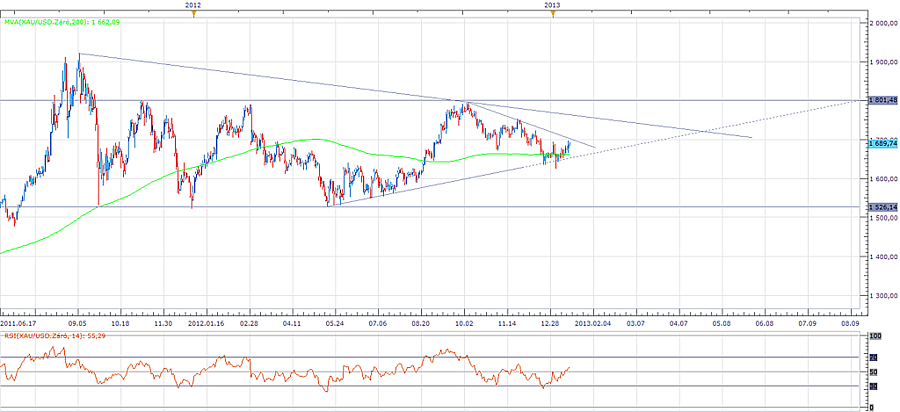 Érdemes azonban azt is látni, hogy talán lefelé van a nagyobb tér a mozgásban, mivel felfelé az 1916 dolláros történelmi csúcstól számított csökkenő trendvonal 1755 dollár környékén megfogja már az árfolyamot, amit elég nehéz lesz áttörni, hiszen 2011 szeptembere óta ezt nem sikerült az árfolyamnak. Ugyanakkor lefelé csak az elmúlt egy évben kialakított sávszélnél van erősebb ellenállás, ami 1525 dollárnál húzódik meg. Jelenleg ugyanis a háromszög alsó száránál húzódik a 200 napos ellenállás is, ami a határát jelenti a bika és a medvepiacnak. Így a lefelé kitöréssel ezt is maga mögött hagyhatja az árfolyam.