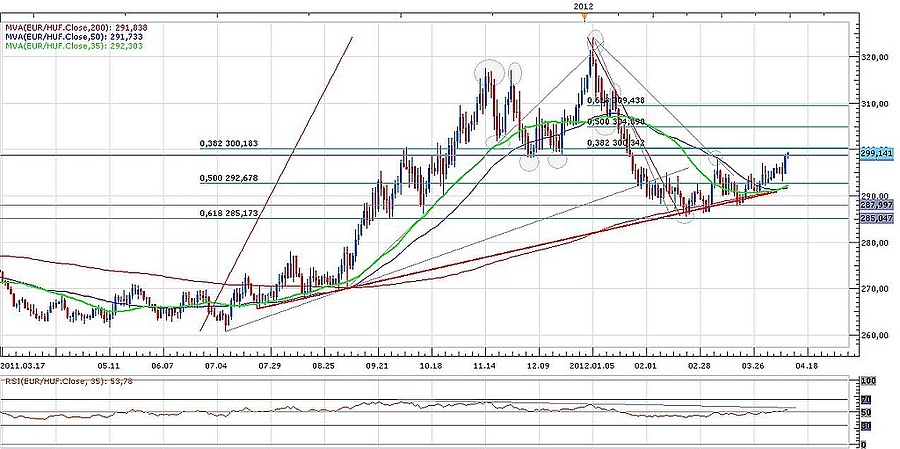 Tegnap és ma délelőtt a 300 forintos szint erősségét teszteli a piac az euró/forint keresztárfolyamban. A 300 forintos euró nem csak lélektanilag jelent fontos állomást - minden kerek számnak jelentősége van - de mivel decemberben kétszer is sikeresen megállította a forint erősödését, ezért korábbi támaszból ellenállássá vált a grafikonon. Ha áttörne - most még csak másdoszor teszteli a piac ezt a régiót az árfolyamban - akkor az egy emelkedő háromszögre emlékeztető alakzatot is érvényesíthetne a grafikonon, amelyből számolt célárfolyam a 315 forint körüli zónába mutatna. Törésről egy 303 feletti zárás eseténe lehetne beszélni.