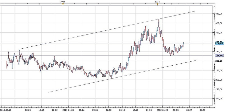 A rossz hír az, hogy bár új, legitim csúcs még nem alakult ki, azonban számos technikai jel mutat arra, hogy a januárban elindult forinterősödési hullámnak vége, s ez középtávú trendfordulót is jelenthet egyben. A trendhez tartozó mozgóátlag elesett, egyelőre érvényes, forinterősödést jelző trendvonal nincs érvényben, a trendhez tartozó 35 napos RSI csökkenő trendvonala további forintgyengülés esetén veszélybe kerülhetne. Ha vannak még tartalékai egy esetleges forinterősödésnek, akkor annak ezen az árszinten illene megmutatkoznia, különben ismét a hosszútávú emelkedő trendcsatorna kaphatna főszerepet az eseményekben, ennek teteje pedig most már jóval a januárban megtapasztalt euró csúcsok felett jár.