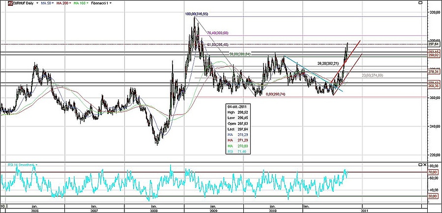 A kedd reggeli új csúcsot már erősen túlvett állapotban közelítette meg az euró árfolyama, így ez alapján egy hamarosan egy heves korrekciós sem kizárt az árfolyamban. A forint gyengülő trendjének fordultában először akkor lehetne reménykedni, ha az euró kurzusának sikerülne a szeptembert végén látott, 285 forintos mélypont alá zárnia.