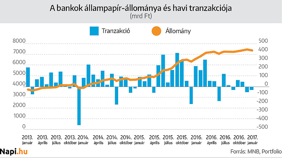 A Portfolio összevetette az MNB adatait tavaly szeptembertől idén januárig, mely szerint a bankok állampapír-állománya 130 milliárd forintra növekedett. Vagyis belsőleg vásárolták meg a papírokat, így egyensúlyozva ki, hogy időközben az Egyesült Államok jegybanki szerepét betöltő Fed idén márciusban és tavaly decemberben is kamatot emelt, miközben az MNB tartotta a 0,9 százalékos jegyzést.
