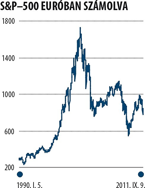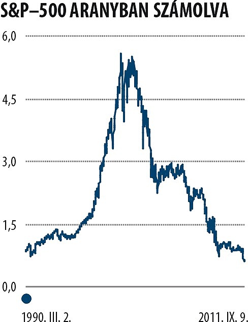 Ha egy európai befektető az akkori mélyponton vásárolt amerikai részvényeket, és azóta tartja azokat, akkor tíz év elteltével 20 százalékos veszteségen ül − kamatokkal nem számolva −, s jelenleg egy az S&P−500-as indexkosarat leképező részvényportfólióból harmadannyi aranyat lehetne vásárolni, mint akkor.