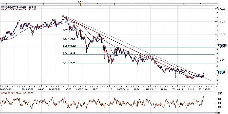 Február eleje óta folyamatos gyengülést mutat az USD/JPY grafikonja. A keresztárfolyam az utóbbi napokban kilépett a tavaly július óta tartó 75-80 jen/dolláros csatornából. A 100 és a 200 napos mozgóátlag hamarosan metszi egymást, ami vételi jelzéssel ér fel. A jelenlegi szinteken konszolidációt várunk, hiszen az RSI már nagyon túl van húzva, utána azonban a határ a "csillagos ég lehet" - vélik az Equilor szakértői. A mellékelt ábra az Equilor ajánlása alapján készült.