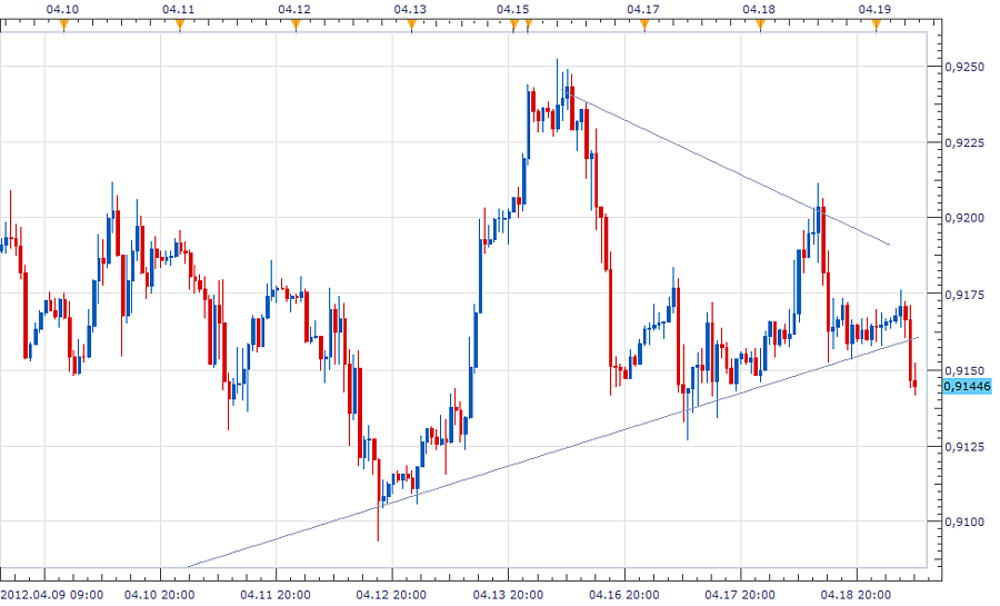 Háromszöget épített az amerikai dollár svájci frank árfolyama néhány napon keresztül, melynek alsó szárát adó trendvonalat letörte az árfolyam. A bátrak akár a letöréskor is megnyithatták az eladási pozíciót, míg az alacsonyabb kockázatú lehetőséget keresők számára csak most jön majd a java, hiszen a trendvonal visszatesztelése újabb eladási lehetőséggel kecsegtethet.