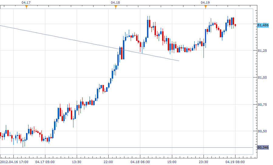 Az USD/JPY 30 perces grafikonján fülescsészét láthatunk egy trendvonalból való kitörés után, mely klasszikusan egy folytatólagos minta. Amennyiben az árfolyam kitör a csésze tetejétől, úgy vételi pozíciót nyithatunk viszonylag szűk stop szinttel, megfelelő profit potenciállal.