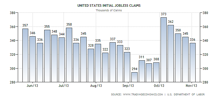 A korábbi torzító hatások-, valamint az amerikai kormányzat újraindulása után ismét csökkenni kezdett a munkanélküli segélykérelmek száma az Egyesült Államokban. Forrás: tradingeconomics.com