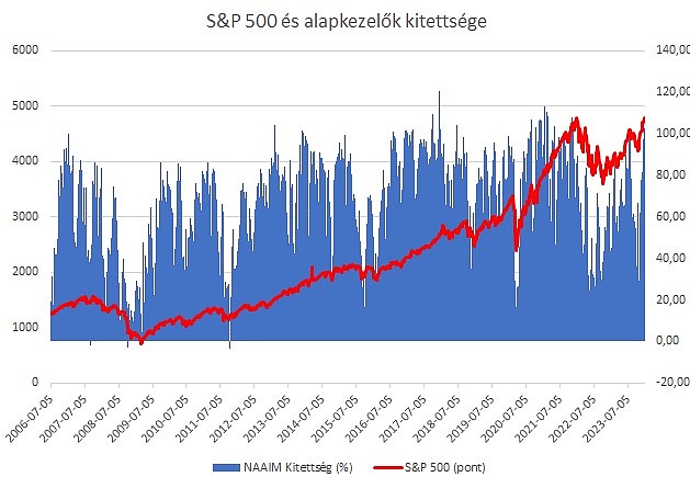 Ráadásul vannak arra utaló jelek, hogy hangulati szempontból kezd szélsőséges állapotba kerülni a piac. Az amerikai Aktív Alapkezelők Nemzeti Szövetségének (NAAIM) kimutatása szerint tagjai körében a kezelt portfóliók átlagos kitettsége az S&P 500-as index irányába immár meghaladja a 100 százalékot. Ez azt jelenti, hogy az átlagos portfólió jelenleg tőkeáttételes részvényvételi pozícióban van. Ez olyan helyzet, amelyet a felmérés történetében nem egyszer követett már éles korrekció.