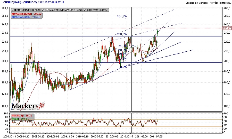 Az árfolyam mindenesetre csak 250 forint magasságában érné el hosszabb távú emelkedő trendcsatornájának szélét, ennek a széles csatornának az alja jelenleg 210 forint körül található, tehát csak egy ez alatti zárás esetén lehetne reménykedni a frank tartó gyengülésének kezdetében. A különböző oszcillátorok jelenleg túlvettségre utalnak a svájci deviza árfolyamában, azonban ez az elmúlt években nem az első eset, volt már ennél túlvettebb is a svájci deviza, s eddig sosem trendfordulót,csak a menetelés megemésztésének kezdetét jelezte előre egy ilyen helyzet kialakulása. Az árfolyam egyébként már felfelé elhagyta a rövid távú emelkedő trendcsatornáját, ami rossz hír abból a szempontból, hogy ez a trend begyorsulásának a jele, jó hír viszont abból a szempontból, hogy a trend begyorsulása sokszor annak végét is előre szokta jelezni időben.