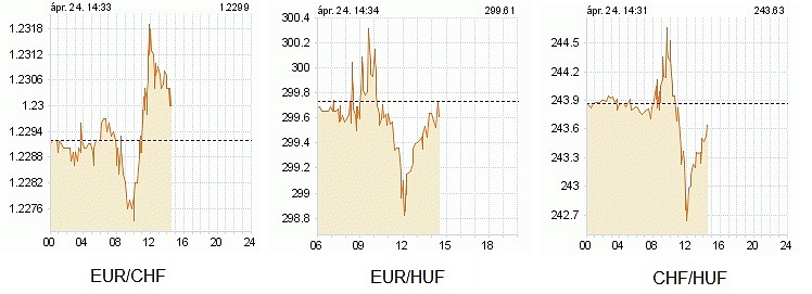 Közel másfél havi csúcsra emelkedett az euró a svájci frankkal szemben, a jegyzés szerda délelőtt 1,2316 közelében tetőzött. Ez a frank forintárfolyamában nem jelentett túlzott csökkenést - a kurzus 243-244 között jár -, hiszen a jegyzés másik meghatározó faktora, az euró forintárfolyama továbbra is a 300-as szint körül legyez. A Reuters beszámolója szerint a piacon tegnap olyan pletykák láttak napvilágot, amelyek szerint a svájci jegybank (SNB) emelni készül a 2011 szeptemberében bevezetett 1,20 EUR/CHF-es árfolyamküszöböt, mégpedig 1,25-re, azaz gyengítené a frankot. Az euró frankkal szembeni gyengüléséhez hozzájárulhattak továbbá a gyenge eurózónás illetve németországi makroadatok is.