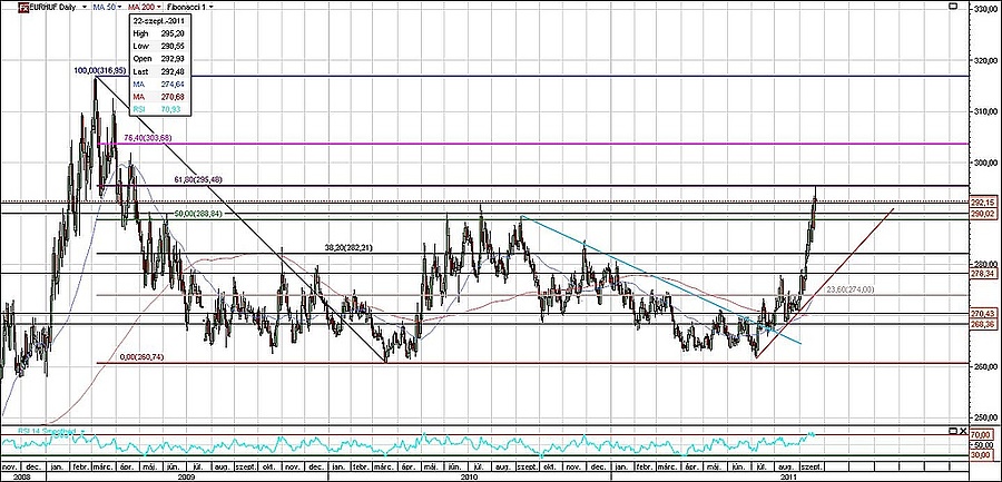 Reggel újabb forintgyengülési hullám bontakozott ki a bankközi devizapiacon, az euró 2009 tavasza óta nem látott szintre, 295,2 forintig drágult. A gyengülésnek egyelőre úgy tűnik, a 2009 márciusi 317 forintos csúcs és a 2010 márciusi 260 forint feletti mélypont közötti távolság 50 százalékos szintje parancsolt átmenetileg megállót, egy órával később az innen pattanó árfolyam minimálisan, 293 forintig korrigált. A forint ezzel nem hagyta el a veszélyzónát, a tavaly nyári euró csúcsok jelentette ellenállási zónán egyelőre úgy tűnik, átrágta magát az árfolyam. Ha e feletti zárásokat tapasztalnánk, az rendkívül kedvezőtlen lenne a hazai deviza szempontjából, mivel e szintek felett már csak 300 forint feletti magasságokban lehet technikai ellenállásokat találni.