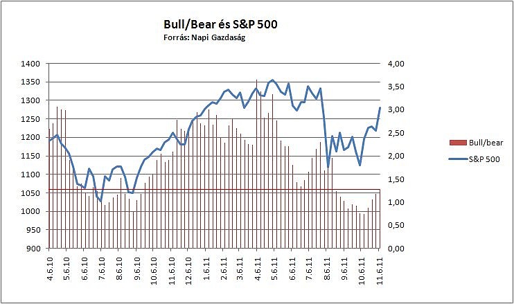 A független tőkepiaci hírlevélírók részéről ennél azért mérsékeltebb hozzáállással lehet találkozni, az azonnali részvényvásárlást javasló szakértők aránya egy százalékponttal 44,2 százalékra kapaszkodott fel a héten, a részvényeladásra biztatóké 36,8 százalékról 34,7 százalékra csökkent. A felmérés bull/bear hányadosa 1,27-ra nőtt, ami semleges, enyhén pesszimista hozzáállásról tanúskodik, igaz ha medvepiaccal van dolgunk, akkor nem is várható hogy a hangulat ennél drasztikusabban javulni tudna.