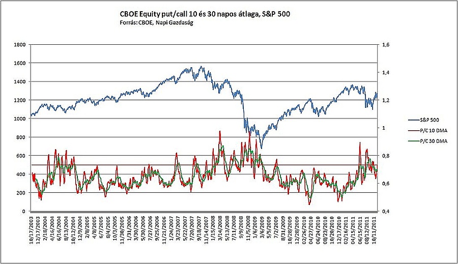 A Chicago Board Options Exchange-en az októberi rally kifulladását követően ismét emelkedni kezdett a megvett eladási opciók aránya a vételiekhez képest. A put/call hányados 10 napos átlaga 0,73 körül jár, ami inkább fokozott félelmet tükröz a befektetők részéről, semmint felhőtlen optimizmust.