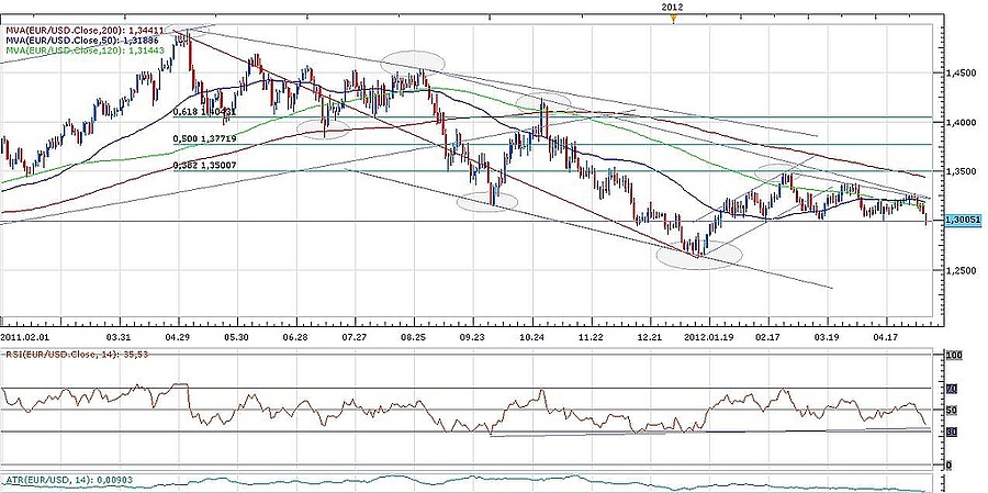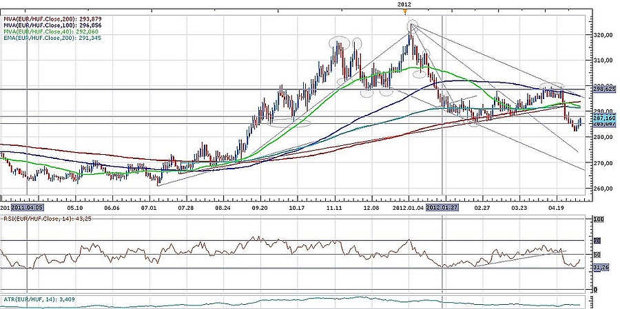 A szereplők jó része emlékszik arra, hogy egy hónappal ezelőtt a vártnál sokkal rosszabb amerikai munkaerő piaci adatok voltak azok, amelyek megindították az esést a világ tőzsdéin. Így nem meglepő, hogy a múlt pénteki várakozásoknál rosszabb adatok ismét jelentősen rontották a hangulatot, ráadásul a hétvégi francia és görög választások eredményei csak erősítik a rosszkedvet. Az eddig kormányzó, euróövezeti tagságban érdekelt kormányzó görög pártok meggyengülése, valamint a Sarkozy-Merkel paktumot újratárgyalni készülő Hollande győzelme egyaránt az euróövezettel kapcsolatos félelmek erősödését eredményezte a piacon, az euró/dollár keresztárfolyam leszúrt a régóta nem látott 1,3-as szint alá. Ha ez a szint elesne, akkor a grafikonon kirajzolódó alakzat akár egy 1,25 körüli euró/dollár célárfolyamot sem zár ki, így ezen a piacon sincs kizárva a nagyobb mozgás lehetősége.