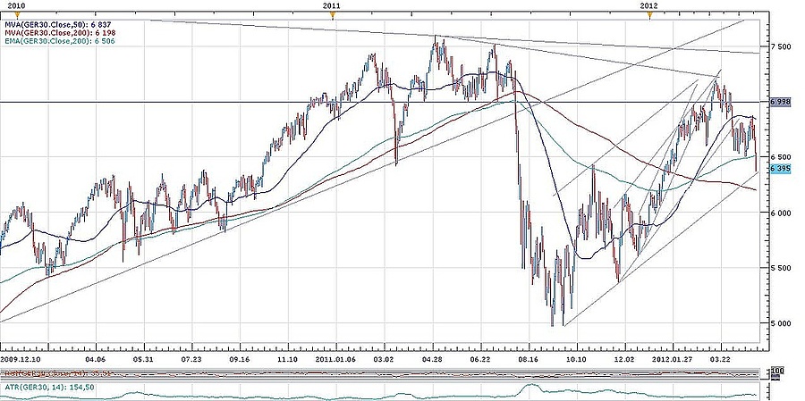 A német DAX index a pénteki 2 százalékot meghaladó esés után ma reggel további, 1,5 százalékot meghaladó eséssel készül indítani a határidős jegyzések alapján. Az index jelenleg az utolsó, a tavaly október óta tartó emelkedő trendhez kapcsolható trendvonalat teszteli, a 200 napos exponenciális mozgóátlagát 6500 pont magasságában letörte, a 200 napos egyszerű mozgóátlag még 3 százalékkal az index jelenlegi értéke alatt helyezkedik el mintegy 3 százalékkal.