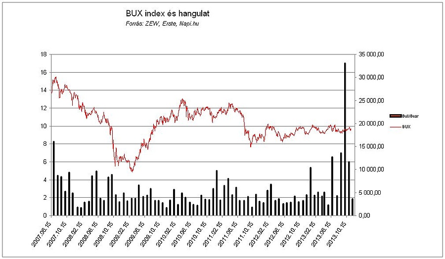 A BUX indexszel kapcsolatos hatalmas optimizmus két hónap alatt teljesen elolvadt. Míg októberben még elképesztően magas volt a magyar részvényektől emelkedést várók aránya, addigra ez az érték mostanra átlagos szintre olvadt. A felmérés bull/bear hányadosa 1,9-re csökkent, két hónapja még abszolút rekordon, 17 felett állt a mutató. Ráadásul ez a hangulatromlás úgy következett be, hogy közben az index nem mozgott jelentőset. Ez jó jelnek tekinthető a további teljesítmény szempontjából.