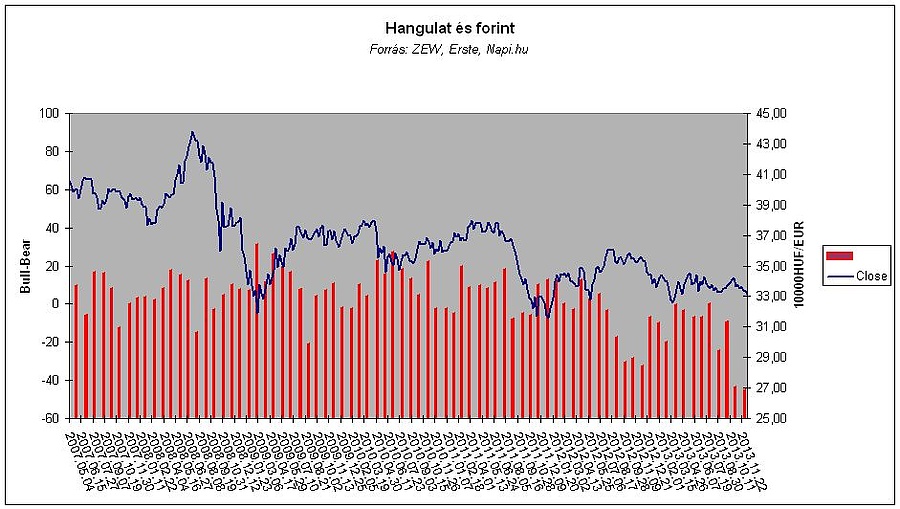 A forinttal kapcsolatban már egy hónappal ezelőtt is elképesztő szélsőségeket öltött a pesszimizmus a szakemberek körében, ez azóta tovább romlott. Immár nettó 45 százalékuk gondolja úgy, hogy hathónapos időtávon gyengül az euróval szemben, ez 1,5 százalékpont romlás a novemberi helyzethez képest, a felmérés hat és fél éves történetében pedig abszolút negatív rekordot jelent.