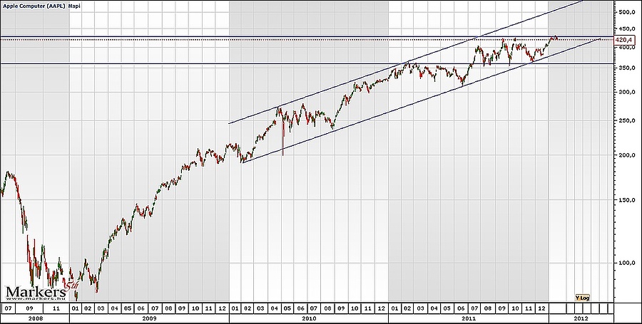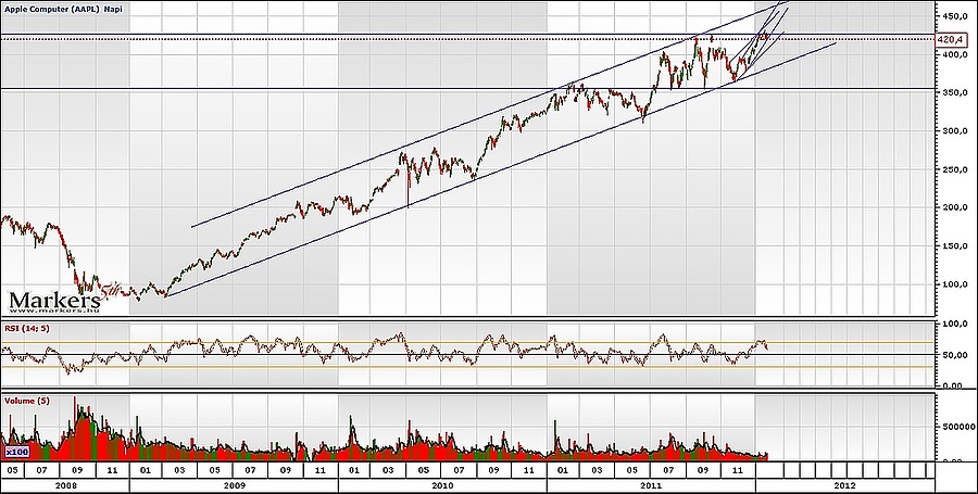 Technikailag az Apple részvények ha a mai piacnyitás után is megtartják jelentős emelkedésüket az amerikai piacon egy hónapok óta tartó sávozásból törtek ki felfelé a sáv két szélét a 360 és a 420 dollár körüli árfolyamok jelentették. Egy ilyen kitörésnél a célárfolyam elvileg a sáv szélességének megfelelő emelkedés lehet, ez 480 dollár környékére mutat. Ugyanakkor a cég részvényeinek árfolyamgrafikonján a 460 dollár a lineáris, az 500 dollár körüli szintek pedig a logaritmikus - az elmúlt három évben lezajlott nagy emelkedés miatt ez utóbbi használata az ajánlott - az emelkedő trendcsatorna tetejét jelzi. Ha valaki vásárolni szeretne a társaság részvényeiből, akkor talán nem ez a legmegfelelőbb pillanat, érdemes lehet megvárni, hogy az árfolyam visszateszteli-e a kitörési szintet 420-430 dollár között néhány héten belül.