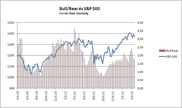 Az egy hónappal ezelőtt megindult korrekciót megelőzően nem uralkodott szélsőségesen optimista hangulat a befektetők körében, az áprilisi mélypontoknál viszont szélsőséges pesszimista hangulat sem alakult ki. A profi tőkepiaci hírlevélírók körében a hét elejére 44,1 százalékról 41,9 százalékra csökkent az azonnali részvényvásárlást javaslók aránya, míg a részvényeladást javaslóké 23,7 százalékon stagnált. Ezzel a felmérés bull/bear hányadosa 1,76-ra csökkent. Március végén még 2,45 volt ez az arány, az elsődleges piaci tetőkre jellemző veszélyzóna határán. A fejlemény egészségesnek tűnik, a szakértők a korrekció hatására egyből pesszimistábbak lettek, tehát nincs jele annak a piacon, hogy kialakulna a a "remény lejtője" amikor a szereplők optimistán és vakon vásárolnak az egyre csökkenő árfolyamok mellett.