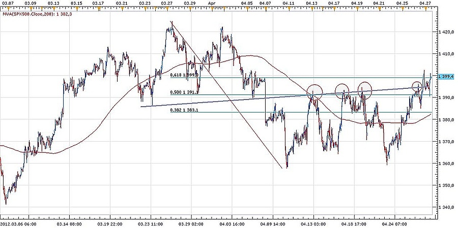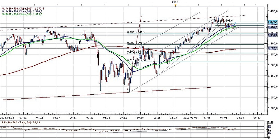 A korrekció eddig arra volt elegendő, hogy az S&P 500-as index a tavaly októberi és novemberi mélypont által meghatározott emelkedő trendvonalig hozza le, ezzel a márciusban kiépült fej-vállak alakzat célára 1360 pont magasságában teljesült is a mutatóban. A fej vállak alakzat nyakvonalát a csütörtöki kereskedésben átvitte az index, s ez jó jel a további emelkedés szempontjából.