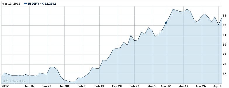 A japán jent is jegybanki intervenciók mozgatták meg az év első három hónapjában, ahol viszont rég látott gyengülés volt jellemző. Ez többek között olyan pozitív mellékhatásokkal járt, mint a Nikkei 225 index 20 százalékos negyedéves emelkedése. A dollár−jen a január végi 76,2-ről indult meg meredeken fölfelé, hogy elérje 84,2-es február végi csúcsát, ám ezt követően szintén szűk sávba szorult.