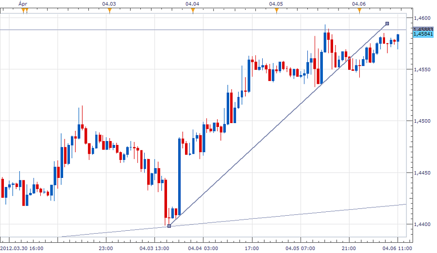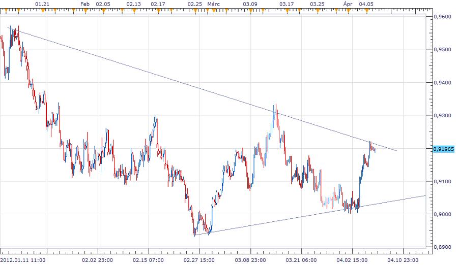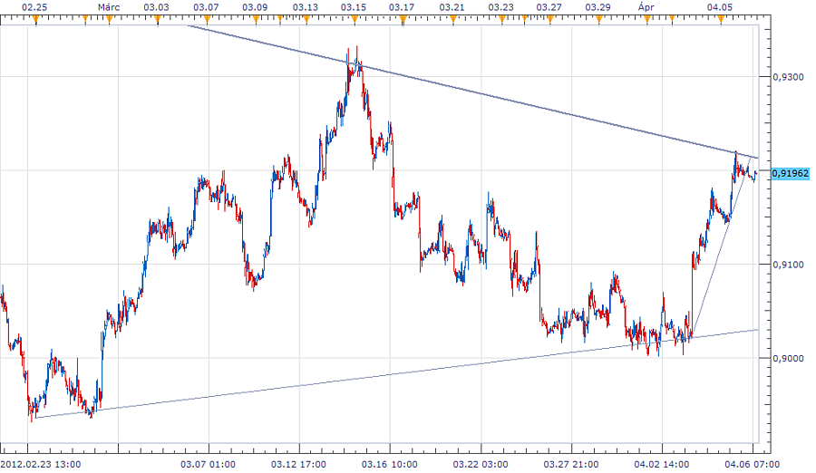 Az órás grafikonon már megfigyelhetjük, hogy az árfolyam egy lendületesebb emelkedés után elérte a trendvonal tetejét, ahonnan visszapattant az árfolyam és letörte a rövidtávú emelkedő trendet. Amennyiben az árfolyam innen elindul lefelé, akkor még mindig lehet benne 150 pip profit lehetőség a háromszög aljáig. Amennyiben pedig felfelé indul tovább, átszakítva a csökkenő trendvonalból álló korlátokat, hosszabb távon akár 600 pipet is emelkedhet az árfolyam.