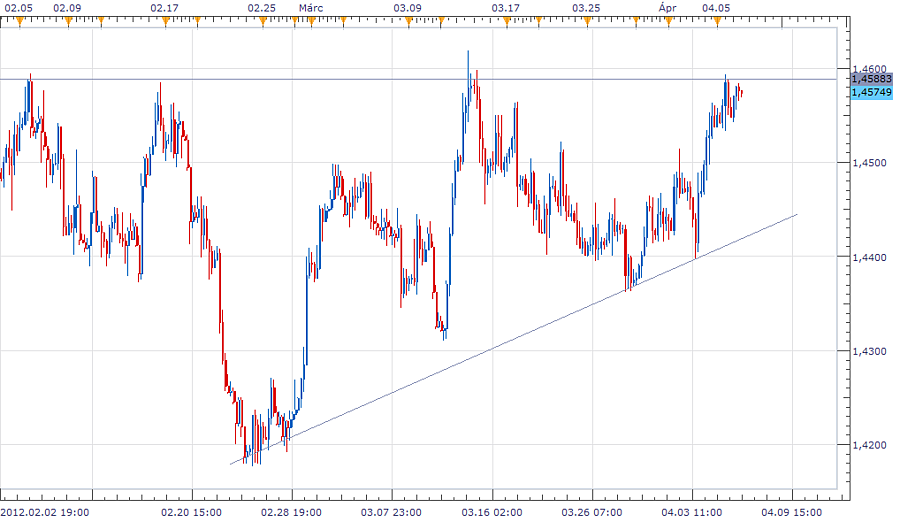 Az angol font, svájci frank 4 órás grafikonját egy igazán szép háromszöget találhatunk, melynek felső szárát az 1,4590 környéki trendvonal, míg alsó szárát az emelkedő mélypontokra húzott trendvonal jelenti. Innen, amennyiben kitör az árfolyam, egy 400 pip körüli mozgásra számíthatunk a jövőben.