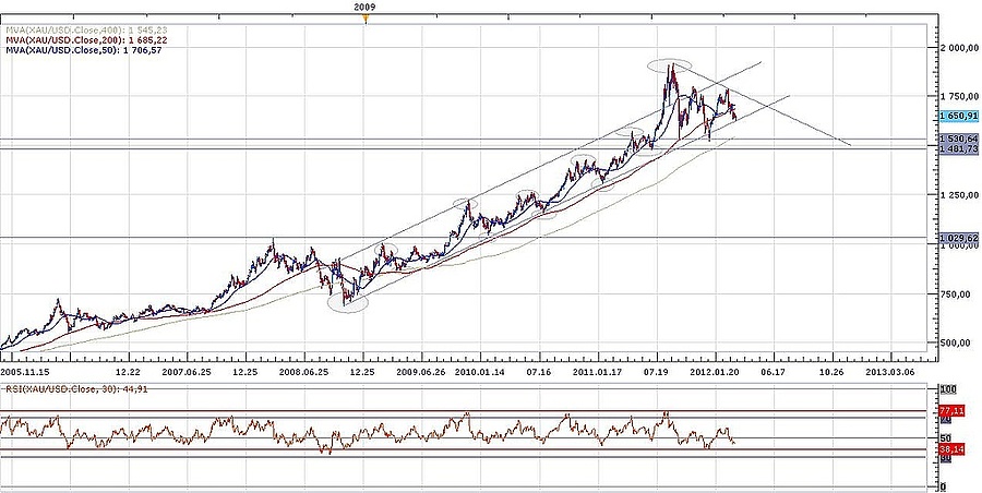Technikailag mindenesetre valóban érdekesnek tűnő fejlemények játszódnak le az arany piacon. Az árfolyam egyrészt újra a 200 napos mozgóátlag alá került a tavaly év végi leszúrást követően. az előtt utoljára 2008-ban járt a mutató alatt a kurzus. Másrészt a napokban egy hosszú, 2008 novembere óta érvényes trendcsatorna alját egy eddig mindig erősnek bizonyuló trendvonalra feszül rá a kurzus.